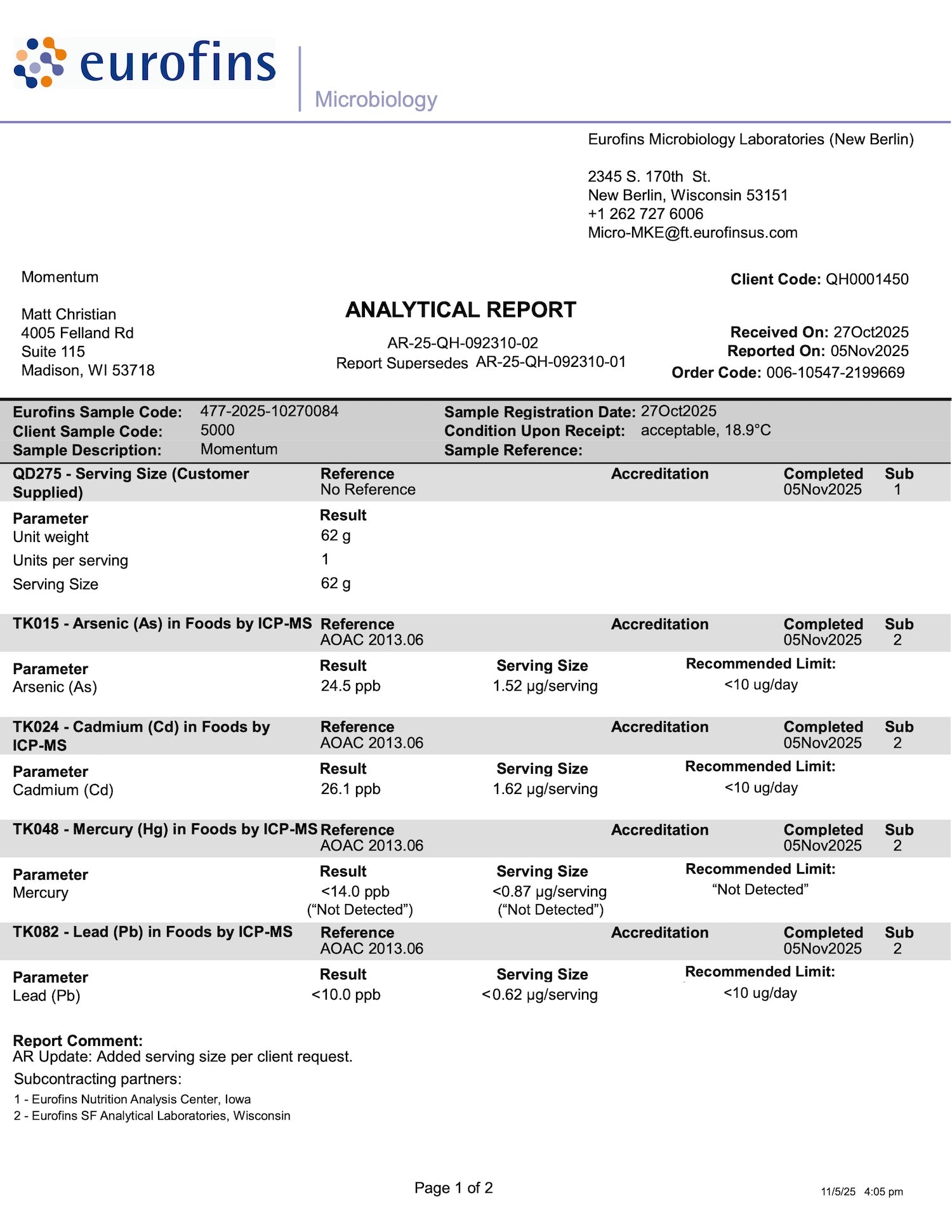 This is a 3rd party test from Eurofins Labs that certifies Momentum is free from E. Coli, Salmonella, Coliform Bacterias, Yeasts, and Molds.